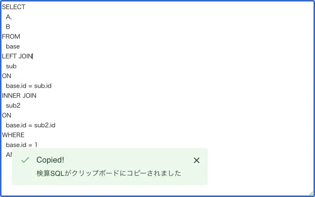 1つめは結果の可視性の向上です。 現状でもSQLのどの箇所のレコード数を示しているかわかるのですが、 見比べて確認する必要があり改善の余地があると感じています。 例えば実際のレコード数がでている箇所のSQLを抜粋して、 文字列として結果の箇所に出すなどができると良いかなと感じています。