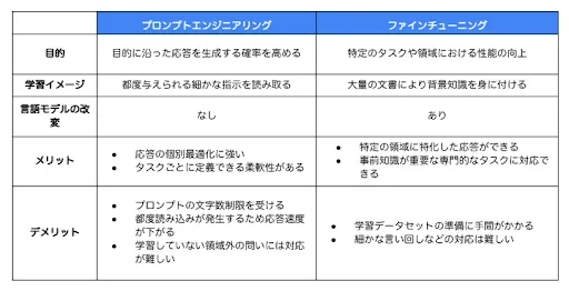図2:プロンプトエンジニアリングとファインチューニングの比較表