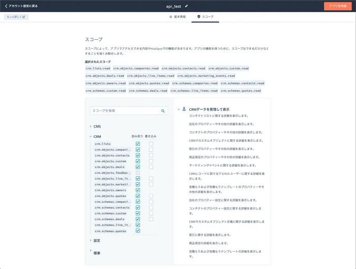 非公開アプリはそれぞれ権限を付与することができ、今回は主にCRMのデータ抽出(読み取り)の権限を付与しました。