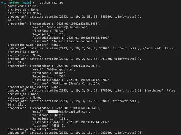 HubSpot APIリファレンスドキュメントにある通り、HubspotAPIはNode.Js・PHP・Ruby・Pythonのクライアントライブラリーが存在します。 今回はその中のpythonクライアントを用いて以下のようなコンタクトのデータを取得するコードを試してみました。