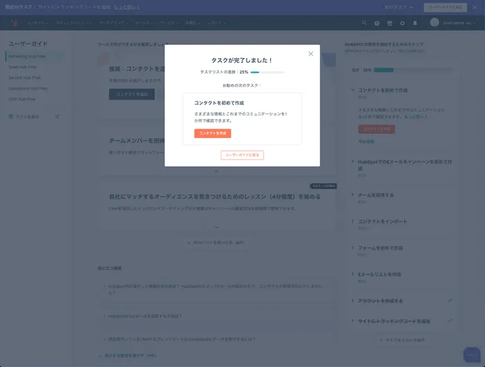登録が完了するとCRMの短いデモが開始され、テストのコンタクトデータを取り込むことができます。機能を使って行くとわかるのですが全機能が基本的にコンタクトを中心として作られており、フォームを送信した際のリード情報などもコンタクトを作ることで作成されます。
