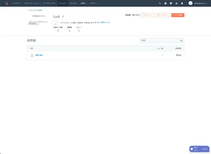 またPDFの閲覧時間がメールで通知として送られてきたり、コンタクト側でもアクションとして確認できたりと、統合的に閲覧ログがHubspot内で閲覧ログが利用されていることがわかります。