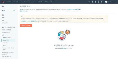 最後にHubspotに集まったデータをAPI経由で取得する方法について確認してみようと思います。 HubspotにてAPIを利用する場合はまず認証のためにtokenが必要であり、 tokenを発行するためには非公開アプリを作成する必要があります。