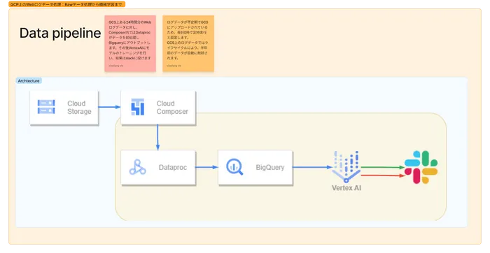 要件として、GCSバケット上でのWebログデータの保存期間が半年です。 クラウド上のインフラ部分ではTerraformで管理し、プログラミング言語についてはデータ処理の部分はScala、パイプライン(DAG)および機械学習の部分はPythonです。
