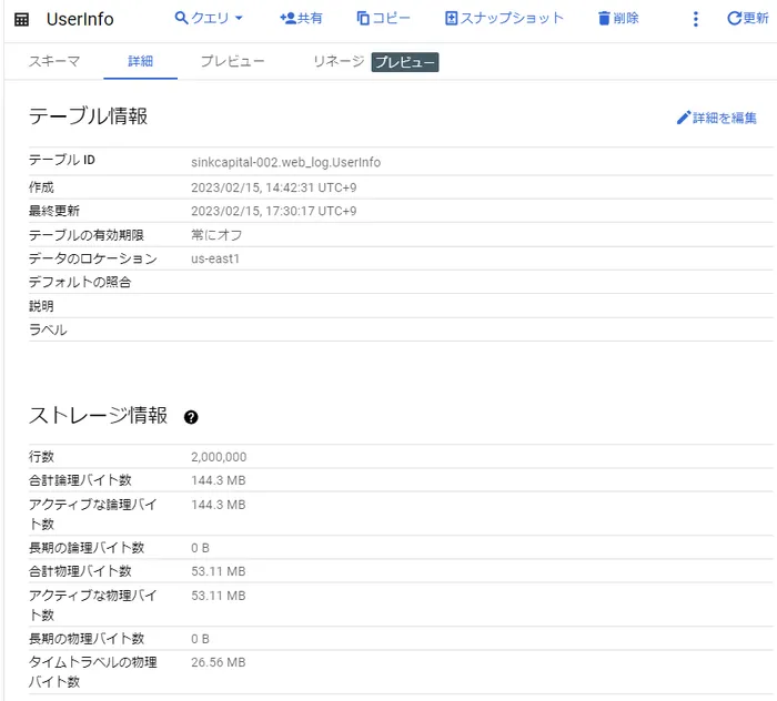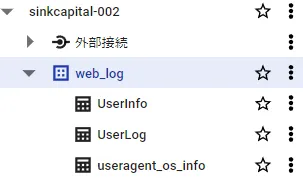 - Bigqueryへの書き込み:テーブル1>>UserInfo、テーブル2>>UserLog