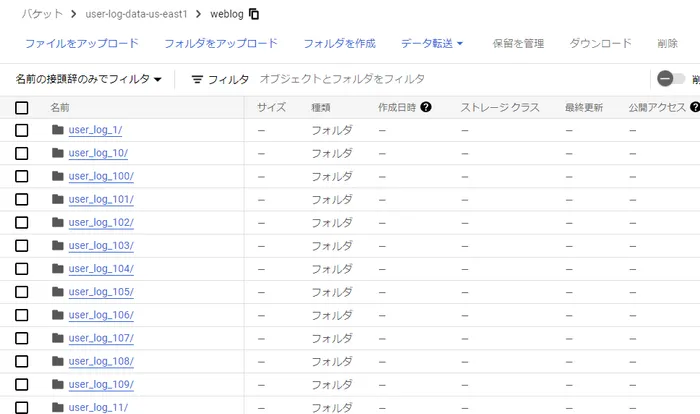 また、ダミーデータ格納用のフォルダ weblog をバケット user-log-data-us-east1 に作成します。