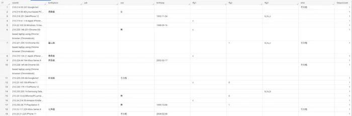 - Other: String(リスト構成:”都道府県(出身地)”,”職業”,”性別”,”生年月日(1993-12-05)”,”flag1″,”flag2″,”flag3″,”その他1″,…)