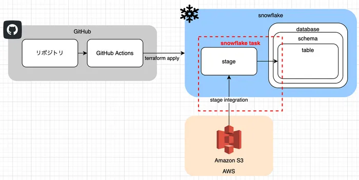 今回サンプルにおいてはSnowflake内部にdabtabase・schema・tableを構築し、 SnowflakeのtaskによってAmazon S3からtableにデータ連携を行う構成で考えています。