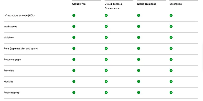 terraformのプレミアムサポートはつかないのと、「5ユーザー」までOrganizationで無料利用可能ぐらいで、 ほぼそれ以外の必要機能は利用できます。詳細はこちらよりご覧ください。