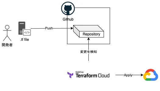 まず、github repositoryとterraform cloudのprojectを作成して監視するブランチを決めて連携します。 次に、開発者がtfファイルをgithub repositoryにpushしてTerraformがファイルの変更を検知し クラウドリソースに変更を加えます。今回は、クラウドプロバイダーにGCPを使用して、GCPのVMインスタンスをterraform Cloudから deployしていこうと思います。