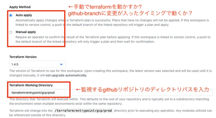左バーからworkspace→settings→Generalで設定を行います。Terraform Working Directoryで監視するgithubリポジトリのパスを入力します。 Apply Methodはいつのタイミングでterraform applyするか、Auto applyのブランチに変更が入ったタイミングで動く方が 管理がしやすいです。設定したら保存するのをお忘れずに。