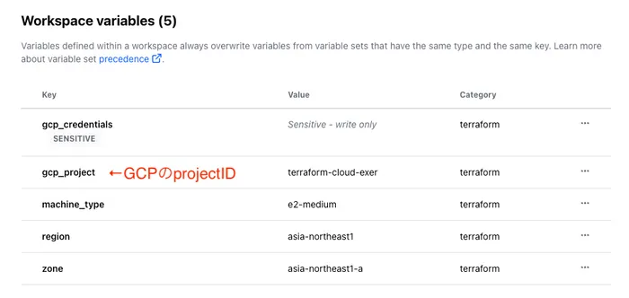 左バーからworkspace→variablesでterraform/gcp/prod/variable.tfの変数の中身を定義してあげます。