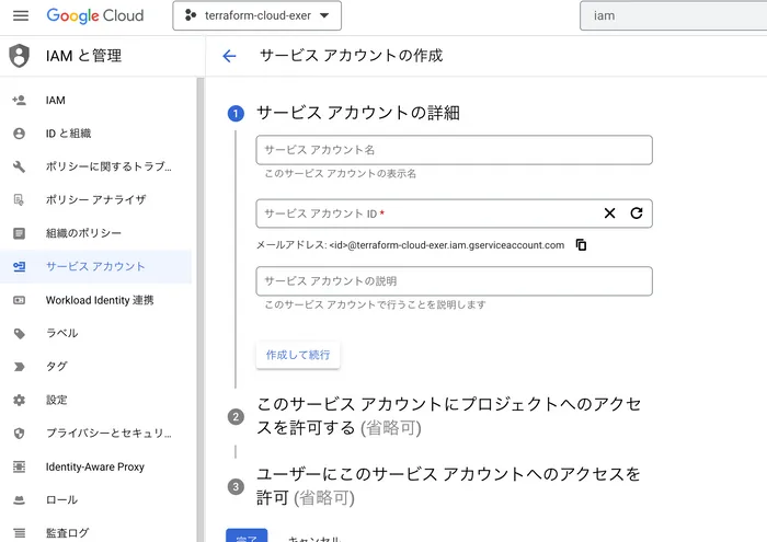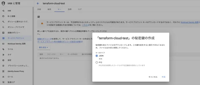 ※この時、IAMアカウントも作成して、サービスアカウントと紐付けて下さい。この時、権限不足だとterraform applyした時に、権限不足でapplyできなくなります。