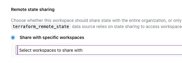 左バーのworkspace→settings→GeneralのRemote state sharingから別のworkspaceのtfstateを指定できます。 VPCなどをdevelopmentとproduction共通にしたい場合などに使用します。